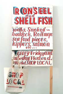 O projecto off-site “Shop Local” intriga o mais distraído dos transeuntes Londrinos. Os cartazes incrivelmente apelativos, numa tipografia que há muito tomámos como desaparecida são incontornáveis e impossíveis de ignorar. Uma tipografia claramente urbana, em cores vibrantes, num corpo e tipo de letra desenhados para coabitarem com edifícios em ruas amplas. Os cartazes apresentam um dos inúmeros trabalhos gráficos por Bob & Roberta Smith (1) para o projecto Britânico “Platform for Art”, em Londres, (2) e publicitam a caravana branca de venda de peixe congelado sem toldo. Este ponto de pequeno comércio encontra-se instalado no Hoxton Street Market há trinta e cinco anos. Os mercados em Londres continuam a existir mas a proliferação das grandes superfícies sobrepõe-se claramente. Talvez por isso, tantas pessoas, em especial jovens estudantes temporariamente habitantes desta cidade, sejam impelidas a invadir aquela zona com olhos curiosos, intrigados, críticos. No Verão passado, para coincidir com o Shoreditch festival, o Peer – uma organizacão de artes independente que desenvolve e apresenta projectos num vasto leque de meios e em vários locais da cidade, comissariou o artista Bob & Roberta Smith para o desenvolvimento de um projecto que envolvesse a comunidade e exponenciasse as particularidades da zona urbana de Shoreditch, especialmente no que diz respeito às suas etnias e estruturas sociais. A ênfase reside na apresentação inesperada da comunidade enquanto promotora da sua identidade, sendo o único mandatório a inclusão de palavras. O artista, nascido e residente no distrito, optou por criar cinco peças de texto especificamente para o bairro, referindo-se ao pequeno comércio aí existente. As características mais relevantes deste projecto artístico são o facto de abraçar o contexto urbano e, em simultâneo, operar a um nível tanto funcional, enquanto publicidade, como artístico, enquanto arte conceptual.