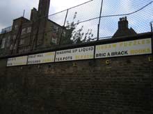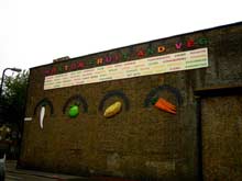 Bob and Roberta Smith, um artista com um percurso académico em pintura, desenvolveu um interesse natural por desenho de letras. Para o lettering do projecto “Shop Local”, colaborou com duas equipas diferentes de designers gráficos que representaram os dois maiores grupos da comunidade: uma equipa de jovens designers e uma equipa liderada por um tipógrafo tradicional também residente em Hoxton. O resultado final é um diálogo entre estilos distintos com lugar num cenário urbano. Um único briefing foi dado às duas equipas — ambas poderiam escolher a sua própria tipografia e técnica. Este método é a voz da abordagem conceptual do Bob and Roberta Smith. Dando poder criativo às pessoas envolvidas no processo (“Make your own damn art”, é um dos motes do artista), assegura a imprevisibilidade do resultado final (4). Como resposta ao briefing do artista, a equipa de jovens artistas produziu stencils em letras Helvetica, uma fonte legível e contemporânea. Um destes trabalhos, com cerca de dez metros de largura e posicionado num edifício Estatal do Pós-Guerra frente a um carril eléctrico da mesma época, anuncia “Hoxton Fruit and Veg”. Na linha abaixo, — tal como nas outras quatro peças — uma lista dos produtos disponíveis na loja respectiva. Uma batata, um rabanete e três cenouras, recortados em metal e pintados em graffiti, aparecem alinhados com as duas linhas que os antecedem. A outra equipa — liderada por Fred, um tipógrafo tradicional — criou murais publicitários pintados à mão ao estilo dos séculos XIX e XX. A equipa pintou letra a letra num processo demorado e cuidado. Fora de moda, e interessantes talvez por isso, este tipo de murais marca uma posição vincadamente oposta à publicidade contemporânea. Estes projectos gráficos foram criados em harmonia com o cenário urbano, enquanto testemunhas visuais da história da área. Pela escolha de publicidade num estilo old-school, com letras pintadas à mão directamente nas fachadas dos edifícios, criam uma ênfase na dimensão histórica. A determinação específica de cada loja tem o mesmo papel, ilustrando as mudanças no local desenhadas pelas sucessivas ondas de imigração.