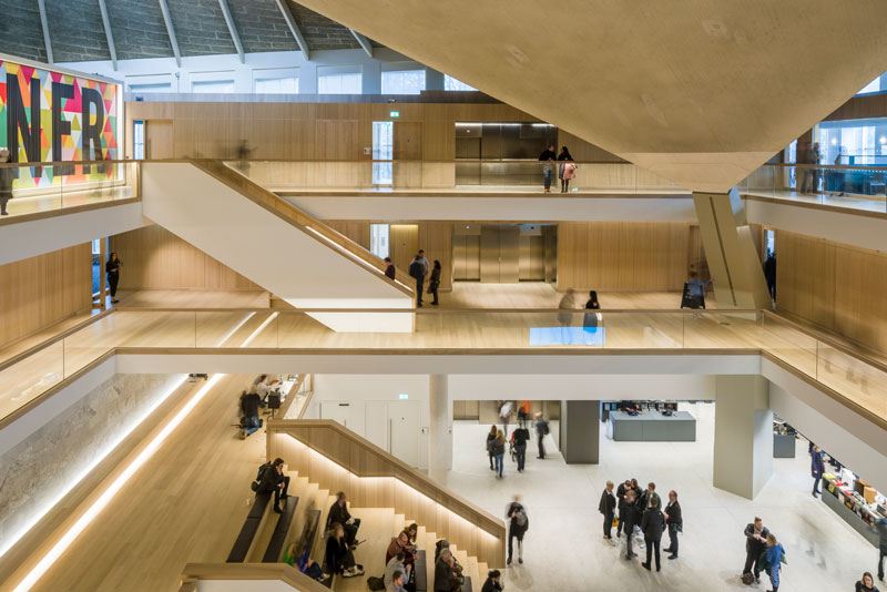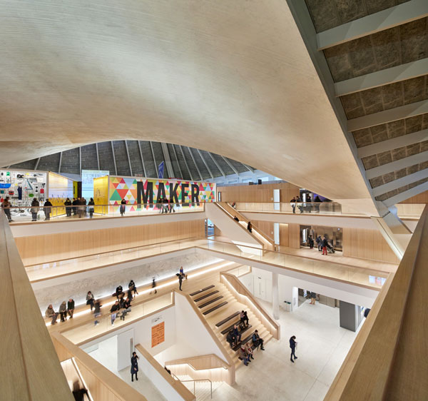 A primeira reacção quando finalmente se entra no Design Museum é de que este é um edifício que se compreende imediatamente: não há antecâmaras, nem percursos, nem várias alas para percorrer. Está-se no centro do edifico, num vazio que como um zigurate invertido revela a geometria da cobertura e cria diversos patamares a partir de onde se acede a cada um dos espaços do museu e que, como um bom foyer, faz do movimento das pessoas um evento em si mesmo. Esta clareza é aliás herdade do museu original e fazia parte do caderno de encargos exigido pela autoridade para o património. Em geral Pawson usa poucos materiais e este projecto é dominado pelo chão e pelos painéis em carvalho claro que forram a maioria das paredes. Mas o uso deste material não é suficientemente obsessivo para que se possa dizer que se instalou uma estrutura de madeira em contraste com o betão original, e acaba por ter um efeito mais decorativo que conceptual. No resto Pawson é mestre; mesmo trabalhando com um orçamento abaixo do que está habituado consegue que para onde quer que se olhe os encontros estejam detalhados na perfeição. Há ângulos onde a cobertura parece que encaixa no átrio e que de alguma forma o completa, e quem olha do patamar superior consegue encontrar outros momentos fotogénicos, mas ainda assim fica a impressão que o edifício existente pedia um projecto menos manso, que desafiasse o original em vez de o domesticar. Pawson respondeu à letra em vez de interpretar o espírito que Gardner havia tentado dar ao interior como uma espécie de panopticon museológico.