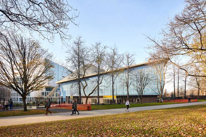 Os três edifícios residenciais, que variam entre os sete e os nove pisos, rodados 45 graus e ocupando uma primeira faixa entre a rua e o Holland Park não seguem o alinhamento da frente construída na Kensigton High Street o que os transforma numa espécie de back-up singers do museu. Na medida do possível para edifícios com conteúdos tão diferentes, Koolhas, que também foi responsável pela recuperação do exterior do edifício original, parece querer por os dois programas a falar um com o outro (a fachada reticulada dos apartamentos segue a verticalidade e a proporção da fachada do museu, a entrada para o museu faz-se atravessando um dos blocos residenciais onde no rés-do-chão está uma das suas lojas) alavancando ao máximo as circunstâncias algo exóticas do negócio de aquisição do terreno, mas também tornando-as omnipresentes. A estratégia é interessante mas inevitavelmente oprime o pequeno museu: não se consegue evitar a sensação de que se vai encontrar ao virar da esquina um letreiro a dizer “propriedade privada” e suponho que os residentes não apreciem especialmente as hordas de visitantes a tirar-lhes as medidas à sala de jantar. Em relação ao exterior do museu pouco mais há dizer, apenas acrescentar que a actualização do envidraçado, ainda que parecido com o original, lhe retirou alguma subtileza: as caixilharias são mais pesadas e a nova cor é um azul mais primário.