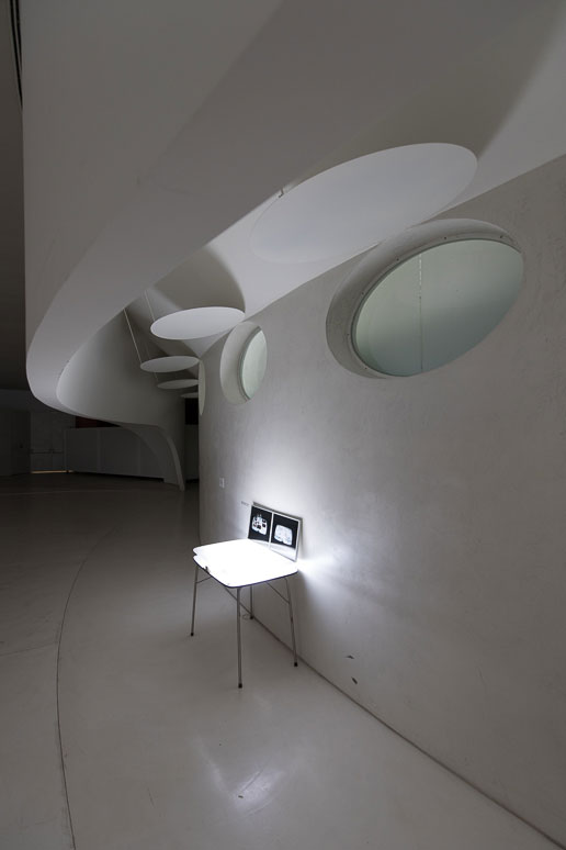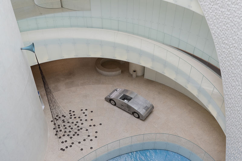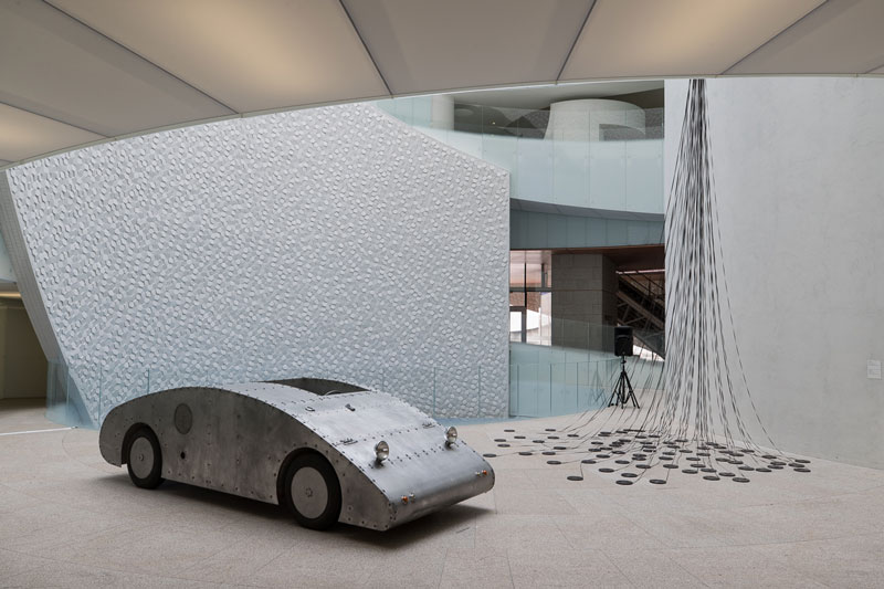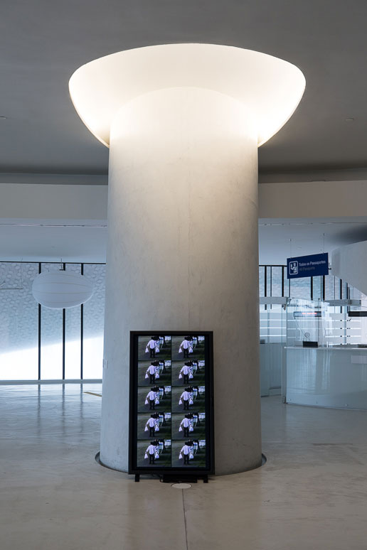 Também as duas obras, dos anos 90, que ocupam o hall de entrada do terminal, manifestam-se inesperadas e, simultaneamente, bem enquadradas. Do lado esquerdo, um carro, objeto de trânsito e passagens, de Miguel Palma, com o título Engenho (1993) e, à direita, uma grande instalação de Pedro Tudela. Esta última, Rastos (1997-98), foi prontamente imaginada pelo curador para ser instalada nessa parede do edifício. Para tal, propôs ao artista que a repensasse e recriasse, alterando a sua posição horizontal para vertical. Como Tudela explica, a peça tanto engole como projeta, representando, assim, um movimento, um outro trânsito, neste caso, visual e sonoro.