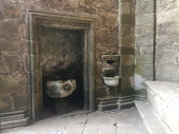 [28] O Caminho Central Português Lisboa-Santiago, desde sempre o mais utilizado, foi aquele que a Rainha Santa Isabel (1271-1336) percorreu centenas de vezes, passando talvez pela Foz. De Coimbra à Mealhada, Anadia e Águeda, Albergaria-a-Velha, Oliveira de Azeméis; seguindo por Cucujães, Arrifana, Grijó, Perosinho, Rechousa, Vila Nova de Gaia; fazendo a travessia numa embarcação de São Pedro da Afurada para Sobreiras ou Cantareira – o que merece um estudo mais aprofundado em torno do referido paço em Sobreiras e da potencial relação com a Ermida-Farol de São Miguel-o-Anjo. As três conchas gigantes do seu altar estão associadas ao Renascimento, a Santiago e ao batismo pela água, sendo São Miguel protetor dos viajantes. Depois do Porto, e sempre próximo ao litoral, o caminho prossegue por São Pedro de Rates e Barcelos. Pelo interior, Lanheses, Ponte de Lima, São Bento da Porta Aberta, Valença do Minho. Na Galiza, Porriño, Redondela, Pontevedra, Caldas de Reis, Padrón, Santa María de Iria, Santa María de Cruces, Teo, Amañecida, Santiago.
