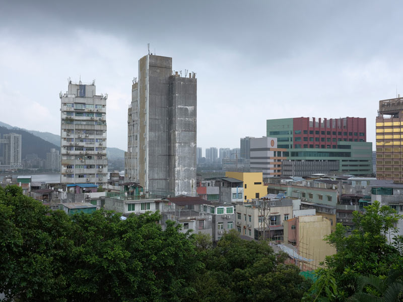 O ensaio visual de Nuno Cera surge no início do livro como um preâmbulo, ilustrando as contradições de uma cidade em “permanente mutação”. Ao longo das 47 imagens realizadas em 2018, o leitor deambula por um território denso e tropical, estranhamente familiar e simultaneamente irreal. Como num palimpsesto, sobrepõem-se edifícios de diferentes tempos e lugares, caracterizando fielmente a condição urbana da cidade peninsular. Para além dos massivos prédios de habitação e suas características “gaiolas”, Nuno Cera capta também a arquitetura festiva dos casinos, que apesar da sua excentricidade surge integrada no quotidiano da cidade. Um ensaio visual que é também um diálogo entre o autor e a cidade, convidando o leitor a percorrer os seus passos.