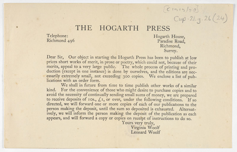 Segundo Tony Bradshaw (2010), Woolf relatou em um de seus diários que foi na ocasião de seu trigésimo aniversário, quando ela e Leonard estavam a celebrar a data em uma casa de chás na Oxford Street, que eles tiveram a ideia de comprar uma prensa tipográfica manual. Dois anos depois, após nutrir crescente interesse e curiosidade pelas artes da impressão, eles se candidataram a um curso profissionalizante de composição com tipos móveis no St. Bride’s Foundation Institute, sede da London Society of Compositors. Ao se recusarem a fazer parte do sindicato dos impressores – um pré-requisito para a inscrição – não foram aceites. Pouco tempo depois, caminhando pela Ferrington Street, encontraram uma loja que vendia uma pequena prensa manual. Ela vinha acompanhada de um sucinto livreto de instruções que deu o suporte necessário para que eles aprendessem a imprimir. Dá-se aí o início dessa aventura.