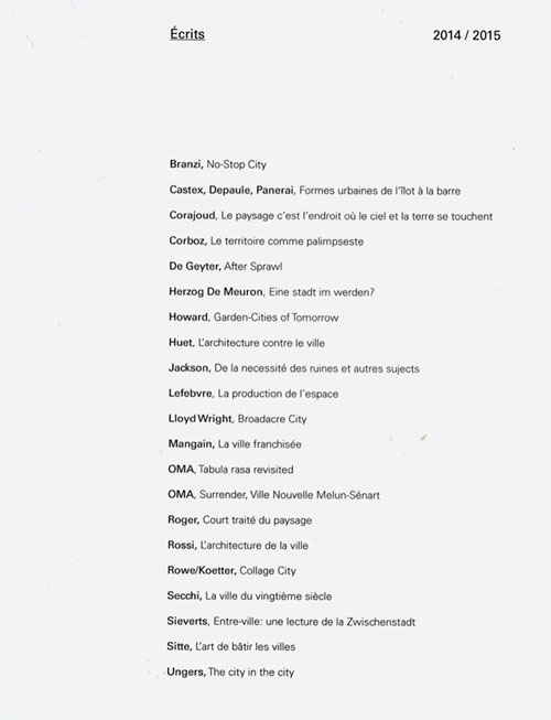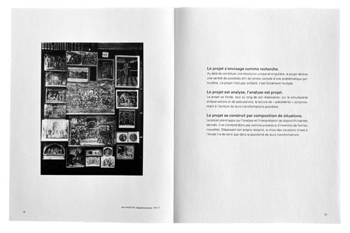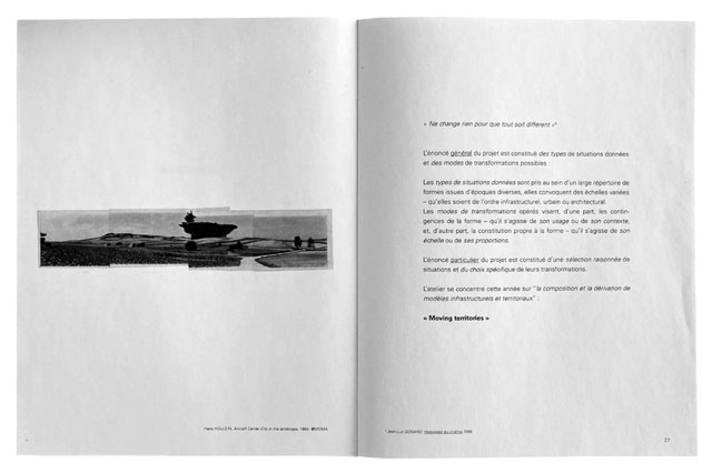 Na faculdade, no início de cada ano, cada aluno do seu atelier recebia um caderno com uma compilação de “documentos”. Nomeadamente, uma série de textos e uma vasta gama de plantas e cortes variáveis no seu tipo, desde cartografia territorial a plantas de edifícios históricos, passando por secções técnicas de diversos dispositivos infraestruturais. Estes desenhos eram previamente editados no escritório, a fim de se tornarem o mais abstractos possível, ou seja, desprovidos de qualquer conotação de época, lugar, autoria, função, escala ou estilo. Desse modo, transformavam-se em composições autónomas, reduzidas a linhas negras (mais grossas ou mais finas, contínuas ou intermitentes) capazes de evocar paredes, colunas, vigas, rampas e escadas (mesmo que não fosse o caso pelo qual tinham sido desenhadas), assim como um espaço em branco – dentro e fora dessas linhas – à espera de ser preenchido.