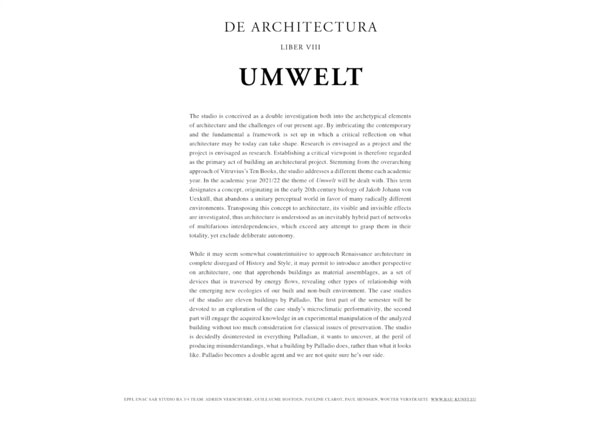 Deste ponto de vista, a arquitectura é considerada como uma prática de pensamento dialógico e dialético, para a qual qualquer distinção entre história, teoria, e projecto – bem como entre disciplinas – é considerada artificial e, principalmente, contraproducente. Portanto, em vez de fornecer aos estudantes um sítio e um programa, encorajando-os a confiar no domínio da criatividade para encontrar “soluções” para um “problema”, os estudantes são convidados a reconstruir a natureza do próprio problema. De acordo com o caderno de introdução da unidade curricular, a arquitectura é considerada como “política do espaço”. Isto significa que a arquitectura deve ser “o resultado de escolhas críticas e racionais”, impulsionada por “um ponto de vista ‘pessoal’ que supera definitivamente a vontade do indivíduo, a fim de tornar-se partilhável” [3].