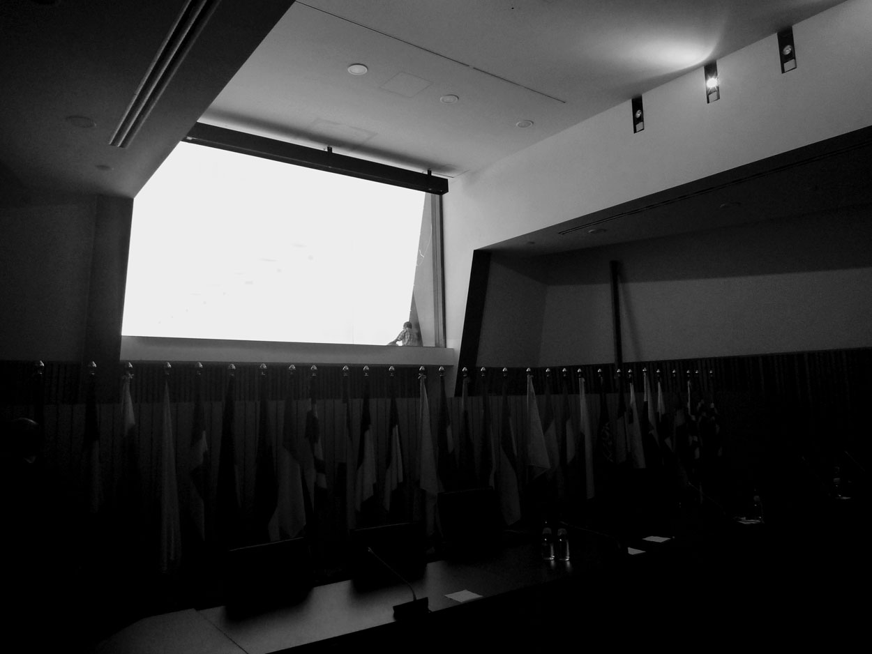 Curiosa, e corroborando a constelação com o Tollan, do ponto de vista da experiência do corpo no espaço, é também a negatividade desta sala oval: Está abaixo do nível do Rio; entre o uterino e o afundado. Para minha surpresa, foi pedida e colocada uma peça metálica no exterior, no lugar onde o homem estava sentado. Esta peça, inclinada, faz com que o Outro escorregue…Prevê, literalmente, a Expulsão do Outro. “Hoje, o mundo é muito pobre em olhares. Raramente nos sentimos olhados ou expostos a um olhar. O mundo apresenta-se como prazer visual que empreende agradar-nos. Do mesmo modo, tão pouco ecrã visual tem o caracter desse olhar. O Windows é uma janela sem olhar. Protege-nos precisamente do olhar”. [17]