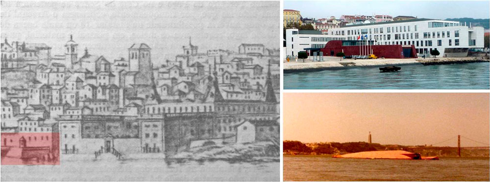 Por esta ocasião, descobri a constelação enquanto acontecimento figurativo do Ser; no meu atravessar diário do Tejo, fui-me familiarizando com este Outro que agora me acontecia. Comecei então a me apaixonar, afinal era tudo uma questão de ponto de vista, percebi que somos o mesmo na nossa diferença. Olhava-o e ele olhava-me de volta, como ambas as margens, uma à Outra. Assim me descobri ponte, i.e., lugar [9], através das ondas mnésicas, desencadeadas pelo magnetismo do tal “outro como mistério”, propiciadas pela investigação em per-curso. Do movimento que é a travessia – da qual fiz e ainda faço quase diariamente um ritual – descobri-lhe reminiscências do Palácio Corte-Real: o seu ritualístico gesto de acolhimento; os seus dois braços – alas – recebiam no seu jardim virado ao Tejo quem atracava no seu pequeno embarcadouro. Palácio este desaparecido com o Terramoto de 1755, e que fora desenhado por Filippo Terzi a par do Paço Real.