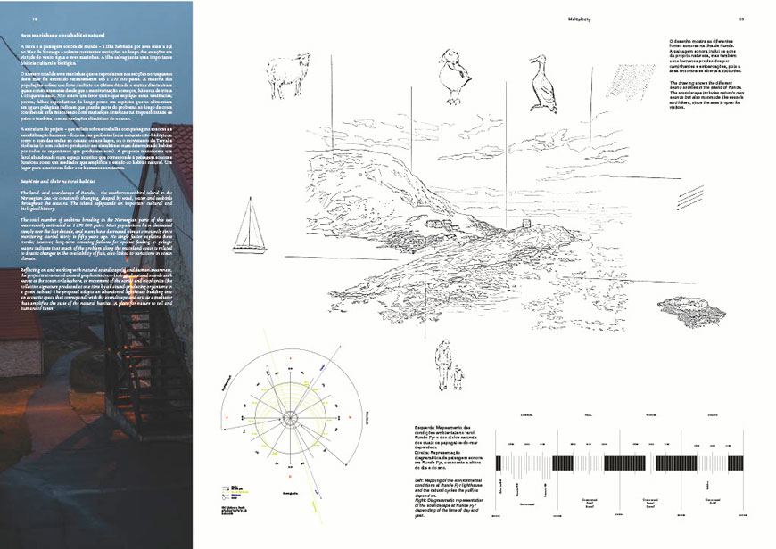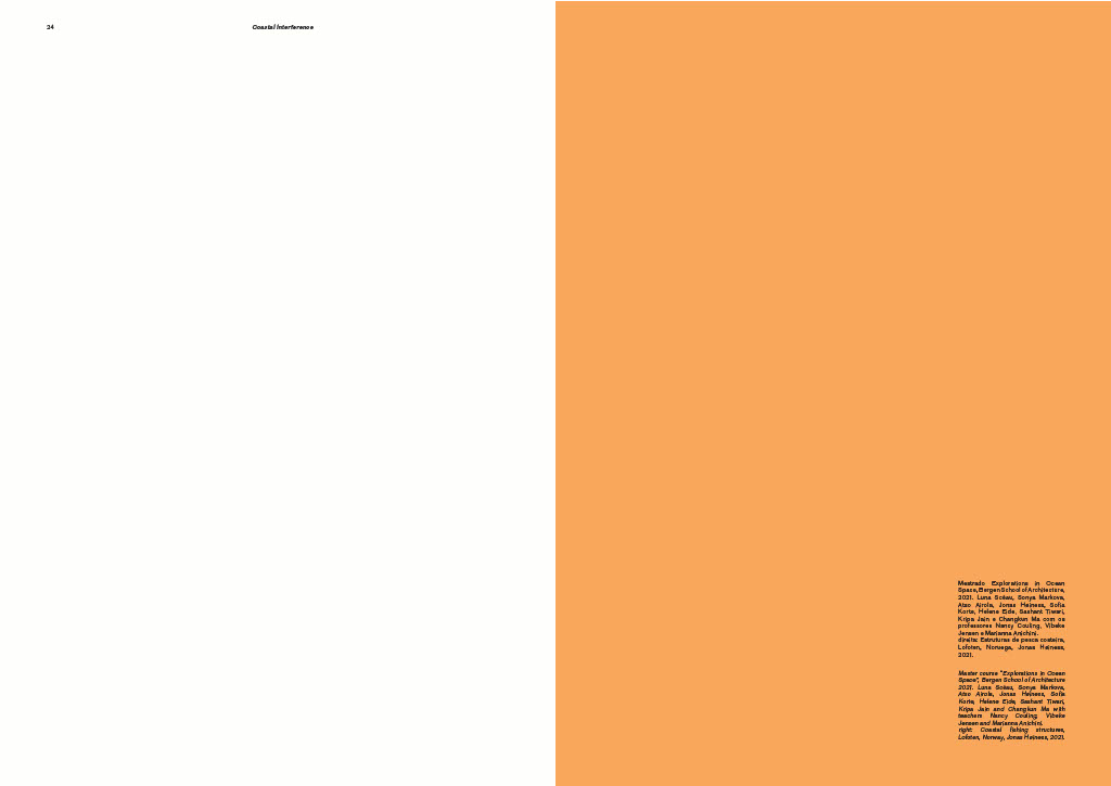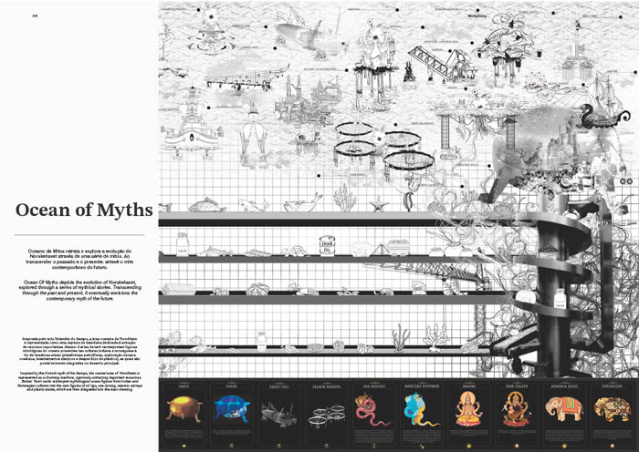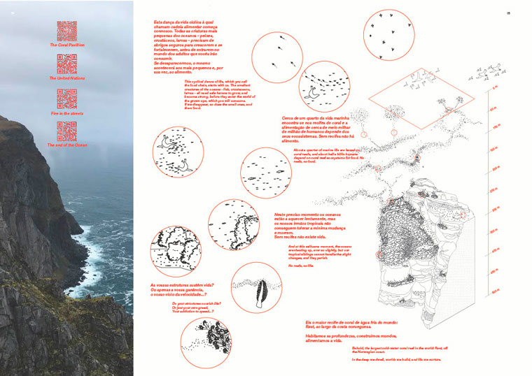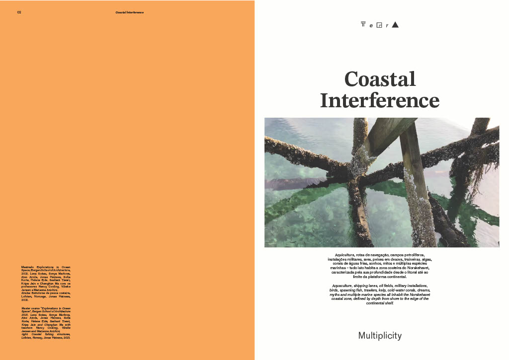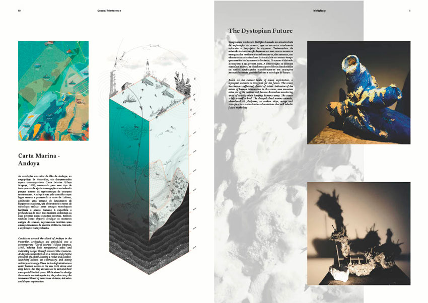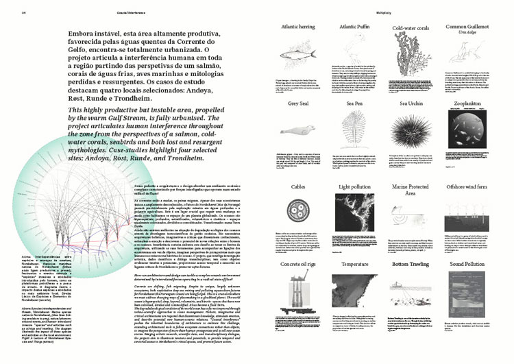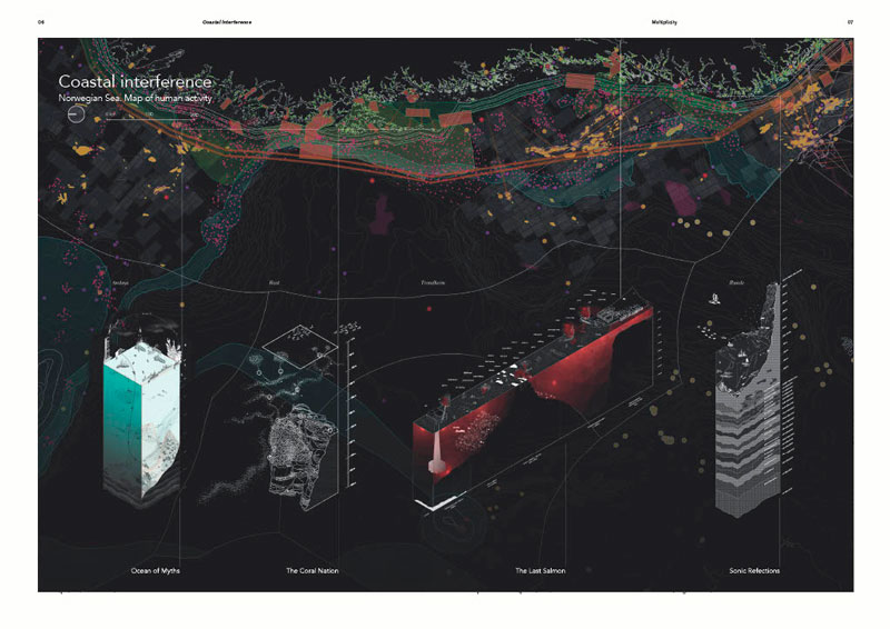 Coastal Interference — o projeto ganhador — é uma aproximação a tudo o que habita a zona costeira do Norskehavet, o mar da Noruega. Deste todo, é parte o aparato resultante da exploração humana, i.e, dos campos petrolíferos, da aquicultura, das instalações militares, até ao delicado ecossistema dos corais de águas frias, considerando ainda como sua parte, mitos e sonhos. Os mestrandos do curso de Mestrado em Explorations in Ocean, usaram a ferramenta própria da arquitetura, o desenho, mas fizeram com que a sua representação gráfica não fosse maior que as partes. Utilizaram, como nos explica Jonas em baixo, um conjunto de mediums artísticos; já que, como refere Morton a propósito de “Enchantment: Causality as Magic”, é preciso superar o pensamento kantiano, no qual, e ainda que em favor do belo, parece existir um limite recomendável para a mente humana se fundir com o não-humano, ou poderemos correr o perigo de ser encantados. Contudo, se não entendermos a arte enquanto decoração, e nos permitirmos sucumbir aos perigos de tal encantamento, teremos acesso então a uma ínfima parte do que pode ser causalidade em termos não-humanos, na media em que a arte causa algo em nós — Ela emite tempo; i.e., outras temporalidades. [18]