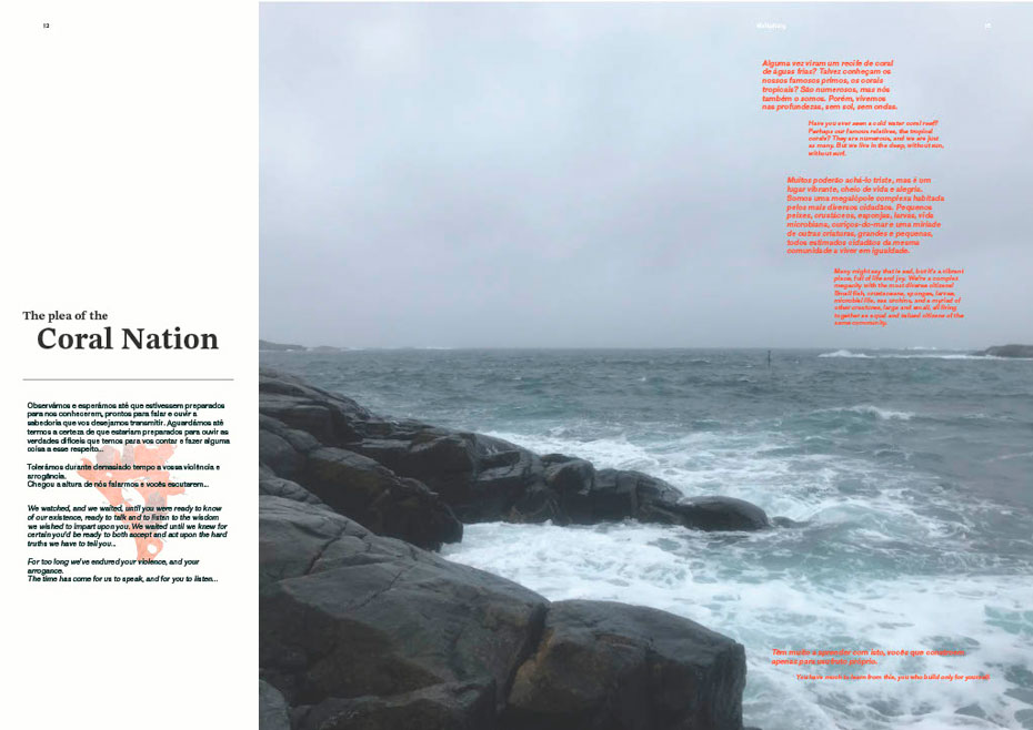 JS: I didn’t know of Fernando Pessoa’s work until recently — thus so far having only read the poetry of Alberto Caeiro —, but immediately connected to him and recognized our similarities. In my exploration of cold-water corals I came to the realization that it would be impossible for me to transfer my deep fascination, but also my worry of the corals to any visitor with the short attention spans, available at such large collaborative exhibitions. Instead I decided to let the corals speak through me. Much like Pessoa and his heteronyms I became the Coral Nation so they could write, draw and communicate for themselves. It’s an exercise in empathy, which comes with many moral questions — isn’t such acts of anthropomorphication a kind of mental colonization? — but once the other emerges one cannot but lean back and enjoy the show. I ease my doubts by remembering how the corals wouldn’t have a voice otherwise.