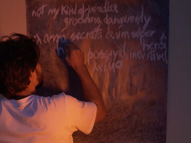Já aqui mencionamos a palavra cura. Rafael (dos Santos) é esse arauto da cura — no plano simbólico, Arcanjo do essencial no interior apercebido ao mesmo tempo no exterior. Partilhamos um certo fascínio pelo Alejandro Jodorowsky, que em tempos disse: “só é arte o que cura”. [10] Conheci-o, precisamente, na exposição Syncronicity, que teve lugar na Plataforma Revólver, onde (se) expôs, com curadoria de Pedro Cabral Santo. Uma conversa inacabada em Março de 2022, foi retomada agora em Dezembro do mesmo ano. Generosamente, partilha o vídeo Not my kind of paradise — e as suas inquietações. Preciso das suas imagens para o meu processo de montagem e edição do tempo, peço-lhe autorização para publicar, junto com este texto, alguns stills — É, que re-conheci neles essa outra velocidade, percebem-na?