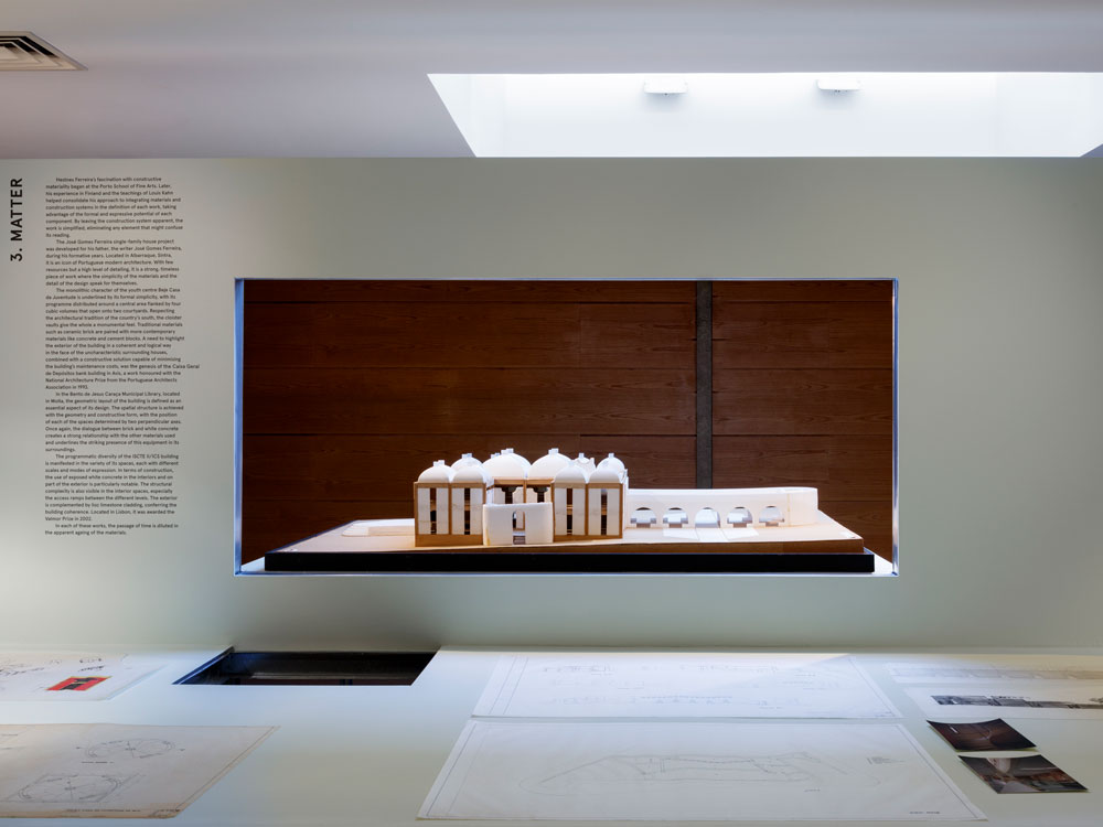 Recuperando o tema “corredor”, secundarizado pelo Modernismo como espaço utilitário, este ganha na obra de Hestnes Ferreira, o que Koolhaas promove como “ativação crítica”: é um espaço além da circulação. E se na exposição toma a forma de janelas de gesso cartonado que “panoramam” maquetas, máquinas fotográficas, desenhos de claro escuro e outros esquissos de arquitetura [2] (agrupados em Forma, Matéria, Luz), nas obras do arquitecto, fora de portas, experienciamos os espaços entrecruzados, as galerias repletas de luz zenital, ou a dança das rampas.