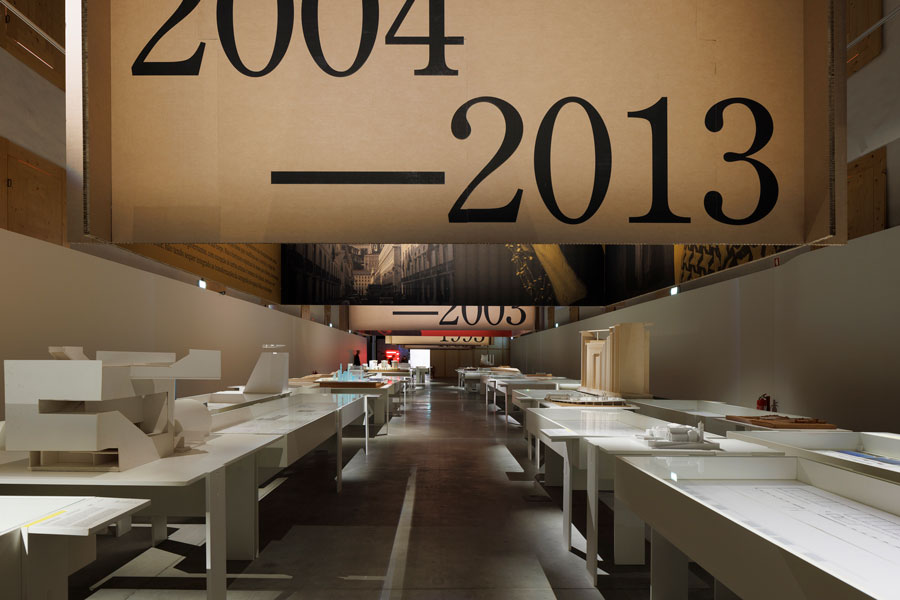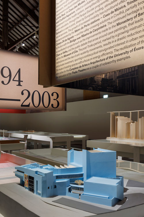 Entre Before e After, duas linhas paralelas, ao longo das quais os projectos de cada módulo se sucedem, configuram três corredores de leitura e circulação. Cada módulo é marcado superiormente por cinco estruturas suspensas de base quadrangular, nas quais, pelo exterior, se indicam as datas, títulos e pequenos textos/apresentações de cada núcleo e, pelo interior, se apresentam referências culturais correspondentes a cada período. Deste modo, a contribuição de arquitectos e arquitectas de várias gerações é contextualizada por manifestações artísticas, culturais e por figuras de referência que ajudam a situar cada período no respectivo imaginário colectivo.