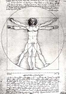 O corpo humano é, desde o inÃcio, uma referência fundamental na arquitectura. Como não podia deixar de ser, o corpo foi sempre a unidade de medida, de escala, de proporção, o referente na construção do espaço. Vitrúvio iniciou o seu terceiro livro com as famosas frases sobre as proporções da figura humana, que se deviam reflectir nas proporções dos templos. Como prova da harmonia e perfeição do corpo humano descreveu como um homem bem constituÃdo, com as pernas e braços esticados, encaixaria nas mais perfeitas figuras geométricas, o cÃrculo e o quadrado. “Esta simples imagem parecia revelar uma profunda e fundamental verdade sobre o homem e o mundo, e a sua importância para os arquitectos do Renascimento dificilmente pode ser sobrestimada. A imagem assombrou a sua imaginação.â€(2) Francesco di Giorgio, Leonardo da Vinci, Fra Giacondo e Cesariano, todos interpretaram a figura vitruviana, tendo o último dito que com ela se podiam definir as proporções de tudo no mundo.