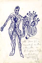Um exemplo desta metaforização do aparelho circulatório é um desenho de Fernando Távora, personagem incontornável da arquitectura portuguesa da segunda metade do século XX e figura tutelar para arquitectos como Ãlvaro Siza e Souto de Moura. Távora participa no CIAM 8, em Hoddesdon, 1951, juntamente com Le Corbusier e Kenzo Tange, numa fase do seu percurso em que, se por um lado se questiona sobre a sua formação pessoal, por outro, procura posicionar-se no mundo da arquitectura. Por esta altura, começou a debater-se a necessidade de desenvolver os centros históricos, a falar-se do “coração da cidade†e de “humanizar a cidadeâ€, num primeiro sinal da gradual conversão dos centros históricos em paraÃsos pedonais. O coração que Távora desenha é um reflexo do tempo em que vive, do fascÃnio, ainda modernista, com a máquina (o coração é a máquina que nos mantém vivos), mas também do seu interesse pelas ciências, chegando a afirmar que é nos compêndios cientÃficos que se devem procurar soluções de arquitectura. Mas é, ao mesmo tempo, uma metáfora do fluir do tempo, da necessidade de repensar o passado e injectar “sangue novo†no presente, de como ser contemporâneo sem perder a memória, questão que foi estrutural na definição do seu pensamento arquitectónico e que marcou toda a sua obra construÃda.