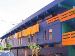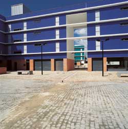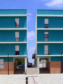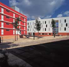 Um dos conjuntos que me agradou bastante conhecer melhor, foi o da Travessa Sargento AbÃlio do Arquitecto Paulo Tormenta Pinto, onde a cor não é logo evidente, não envolve os edifÃcios, aparece apenas quando se entra. De algum modo está contida dentro dos espaços, ainda que exteriores. A referência, foi uma questão de espaço público e privado, e a noção de que cada espaço tem uma caracterização própria. Os espaços contidos pelos blocos poderiam ser considerados como umas grandes salas de estar, ainda que exteriores, (uma sala azul, uma verde, uma vermelha). O Azul é uma clara referência ao Ives Klein, o verde começou por ser uma memória de um verde água da Avenida Paris, e o vermelho era a cor de um edifÃcio da Rua das Trinas de que gostava muito. Segundo este arquitecto “A cor é uma investigação quase pessoal, é uma sensibilidade que se vai desenvolvendo com o passar do tempo, estando a intuição sempre presente. A cor é uma extensão da própria arquitectura, é uma parte fundamental do projectoâ€.