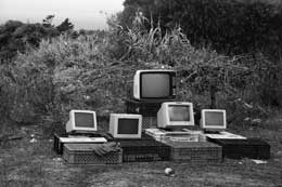 Já fora de Lisboa, num desvio no caminho, e sem procurarmos nada em concreto, demos com um descampado e duas barracas. Nesse vazio de vegetação, um pai tinha alinhado computadores obsoletos e televisores velhos. Estes formavam uma estação de trabalho com 5 postos, sem possível ligação à corrente eléctrica, para os seus filhos brincarem.