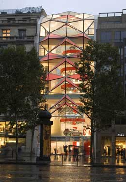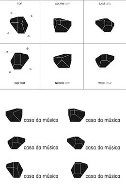 Há edifícios que se deixam contaminar literalmente pelo seu conteúdo: o Pato de Long Island (13) é o ex-libris dessa categoria. Outros podem representar para os designers um espaço incontornável na procura de uma marca gráfica, como explica Stefan Sagmeister sobre a imagem que desenvolveu para a Casa da Música (14). Este refere que, por mais que se tentasse afastar do edifício de Koolhaas, todos os seus desenvolvimentos lhe pareciam arbitrários face à forma única deste edifício. Em oposição, a sede da Citröen nos Campos Elísios, projectada por Manuelle Gautrand, é sugerida pela marca gráfica originalmente desenhada por André Citröen. Em alguns casos, a intervenção gráfica num espaço pode ser tão essencial que, sem ela, todo o edifício que o proporciona perderia; um exemplo disso é a Printshop Veenman, projectada por Neutelings Riedijk Architects e com intervenção gráfica de Karel Martens.