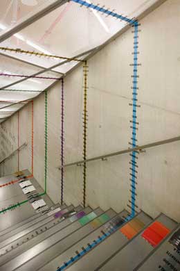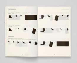 A nossa foi a penúltima de uma série de onze intervenções no edifício da Casa da Música realizadas por designers, arquitectos e artistas portugueses (11). Não incidiu numa das suas salas em particular, mas concentrou-se nos vários espaços e percursos do edifício. Iniciámos duas análises distintas: por um lado, procurámos trajectórias e percursos; por outro, quisemos encontrar uma apreciação emocional das diversas salas por parte dos seus visitantes. Questionámos os trajectos usuais, propondo novas formas de descobrir estes espaços, organizados por ordem alfabética, escala, lotação, cor... Inventariámos, classificámos, contextualizámos; estabelecemos relações entre construído e o habitado. Cartografámos os seus conteúdos e as experiências que proporcionaram aos seus visitantes, representadas de diversas formas em séries inacabadas de «partituras» de dados. Os dados recolhidos foram apresentados sob forma de um livro aberto em cada degrau da escadaria norte da Casa da Música. Parte do conteúdo de cada dupla página contaminava as paredes e listava as palavras obtidas, em questionários aos visitantes (12), para caracterizar cada um dos espaços.