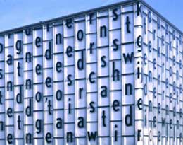 A problemática da representação de um edifício em projectos de identidade visual tem particular interesse no caso do Centre Georges Pompidou (10). O símbolo da instituição, inspirado na fachada do edifício onde se destacam as escadas mecânicas, foi interpretado em 1977 por Jean Widmer. A primeira proposta apresentada – e recusada – não traduzia literalmente os pisos existentes, procurando um equilíbrio próprio. A forma inicial foi então substituída por uma versão menos abstracta do símbolo, reflectindo os 5 pisos reais do edifício.