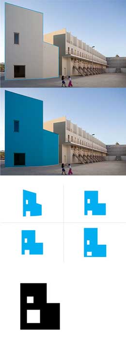 No desenvolvimento de símbolos para identidades visuais para arquitectura, tivemos projectos em que utilizamos referências ao edifício. Por mera coincidência, dois deles desenhados pelo arquitecto Álvaro Siza: o Pavilhão de Portugal, para a Trienal de Arquitectura de Lisboa e o Conjunto Habitacional da Bouça no Porto, para o Atelier da Bouça. Na Trienal, partimos da forma do edifício sendo que durante o processo de investigação experimentamos uma aproximação que traduzisse de forma mais literal a «pala» do Pavilhão de Portugal. Contudo, uma maior abstracção revelou-se mais eficaz: a evocação à existência da pala é feita através de um reforço ao braço do «T», conferindo mais carácter ao símbolo. A forma é um híbrido – parte letra, parte edifício – que nasce de uma sugestão da forma do Pavilhão ao integrar igualmente as letras «T» e «L» de Trienal de Lisboa.