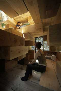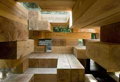 R: Sim, este é um projecto muito especial. O projecto é construÃdo em troncos de madeira empilhados e encaixados entre si. Tem uma apropriação sensorial. Este projecto vem no seguimento de uma pesquisa muito conceptual, a “Primitive Future House†onde querÃamos desenhar apenas o mÃnimo através da análise da composição de degraus enquanto campo para habitação. Foi a materialização dessa pesquisa, foi isto que entendi como a casa ideal do futuro. Ou seja, uma casa onde sejam exploradas ao máximo as relações entre o corpo humano e o campo onde se movimenta, puro pensamento conceptual. Como um “espaço-cavernaâ€, onde as pessoas se apropriam e usam o espaço de forma criativa. Elas decidem como sentar, dormir, viver. Uma espécie de sistema em aberto, em oposição ao “espaço-ninho†elaborado para uma função especÃfica. Não feito para uma função mas uma paisagem ou terreno funcional na sua globalidade - este é um dos pressupostos da minha arquitectura. Talvez toque um pouco na tradição japonesa, de apropriação de espaço, em que tiramos os sapatos, nos sentamos no chão. Mas penso que vai além disso. Quero voltar atrás, a uma condição original, a elementos realmente primitivos de relacionar o corpo humano e o espaço.