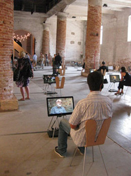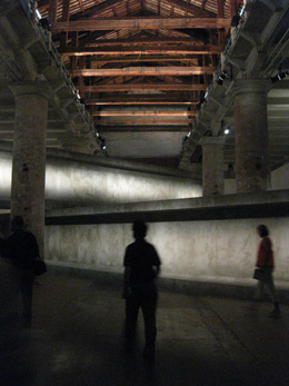 Mas esta não é a primeira vez que sentimos a presença de Francisco e Manuel Aires Mateus. Já no Arsenale os pudemos ouvir a falar com Hans Ulrich Obrist, numa de entre as suas muitas entrevistas. No entanto, a dupla de arquitectos portuguesa não sai bem representada desta conversa. Obrist quer saber o passado dos dois, quem os inspira, qual é o seu manifesto; em resposta, os arquitectos não conseguem elaborar sobre o que os move, limitando-se a formular generalizações sobre o que os “outros” acham do seu trabalho, e declarando no final que “mais do que um certo manifesto, o tempo dirá o que estamos a fazer.” Incapazes de verbalizar as complexidades do trabalho que apresentam nesta Bienal, os Aires Mateus retiram corpo à sua presença.