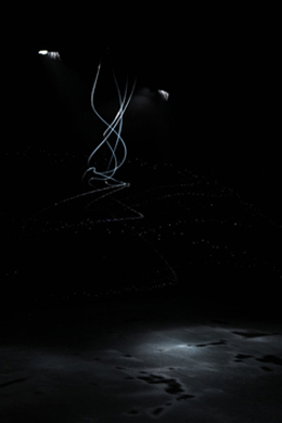 Olafur Eliasson apresenta o hipnótico “Your Split Second House” numa sala completamente escura, onde uma série de mangueiras suspensas do tecto giram ao mesmo tempo que gotejam água. As formas incríveis que daí surgem são congeladas no tempo por luzes estroboscópicas, e enquanto o nosso cérebro se tenta habituar às que se desenham à nossa frente já novas estão a acontecer. O ritmo é alucinante e Eliasson cria espaços belíssimos, utópicos e fantasmagóricos, e mais uma vez os sentidos do visitante são chamados a intervir — o chão está ensopado, escorregadio, o ar húmido.