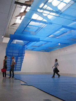 Mais à frente, o arquitecto Tetsuo Kondo colabora com os engenheiros Transsolar no fabuloso “Cloudscapes”. A temperatura e humidade na sala são controladas por um ambiente fechado, permitindo a criação de uma nuvem artificial a cerca de três metros do solo. Uma rampa de desenho simples e contido permite subir até aos cinco metros de altura do espaço, passando pela nuvem e experimentando a sua humidade sufocante — mais acima, o calor sobe até aos 37º mas a humidade desvanece-se, até descermos de novo até ao chão. Aqui, o espaço é físico e metafórico, e a sua imaterialidade transcende a representação visual, actuando no visitante a todos os níveis.