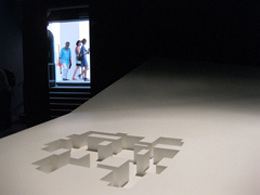 Mais etéreas, voltando à matéria dos sonhos, estão a “Blueprint” dos Doh ho Suh and Suh Architects, e a “Detached” dos Pezo von Elrichhausen Architects. A primeira, uma estrutura em tecido azul, é uma representação tridimensional à escala 1:1 da fachada da casa dos arquitectos em Nova Iorque, que flutua no ar como uma nuvem, e é projectada no chão da sala. “Detached”, por sua vez, apresenta mais uma participação chilena que reflecte sobre a vida dos edifícios quando descontextualizados do seu ambiente. Pequenas maquetes em betão vivem em frente a reproduções fotográficas do seu contexto; ao perder a sua especificidade ficam perdidos no espaço, tornando-se volumes estranhos e melancólicos.