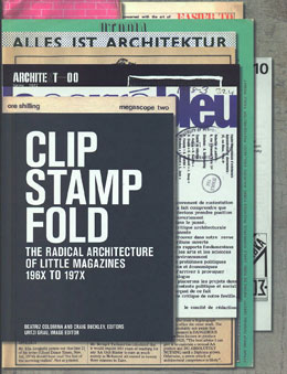 A littleness, ou a pequenês, atribuída a estas publicações não se traduz necessariamente na sua dimensão ou no tamanho da sua edição. Vemos representadas em Clip/Stamp/Fold revistas de referência com histórias que antecedem e sobrevivem ao período estudado como a L’Architecture d’Aujourd’hui, a Casabella, a Architectural Design ou a Lotus. É intrigante ver como estes projectos editoriais surgem em conjunto com outros de carácter mais circunscrito no tempo e que são, de facto, em termos materiais e de meios, revistas pequenas, muitas vezes de produção artesanal: panfletos desdobráveis, conjuntos de fotocópias agrafadas com graus muito distintos de sofisticação gráfica. Em Clip/Stamp/Fold, descreve-se este período como um moment of littleness, onde estas publicações estabelecidas, muitas vezes em resposta a uma conjuntura económica desfavorável, encontram nessa adversidade uma janela de oportunidade para as mudanças nas suas políticas editoriais, com reflexo nos meios materiais usados, como o papel e os tipos de impressão, nos autores e nos projectos escolhidos. É neste contexto que surge o Cosmorama na Architectural Design com o seu entusiasmo pela ficção científica, as estruturas insufláveis, as tecnologias de comunicação e as drogas, ou que em Casabella se promove a Arquitectura Radical, de que são exemplo as colagens de grupos como os Archizoom.