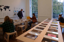Na parede, um mapa do mundo localiza a origem das publicações e, em quatro ecrãs iPad, os 60 grupos editoriais representados respondem através de um registo em vídeo a quatro questões: "Qual a relação entre a arquitectura e o acto de publicar?", "Como se ‘edita’ arquitectura?", "Qual o papel do formato impresso na era digital?" e "De que modo estão a mudar as publicações de arquitectura?". Um quinto iPad permite a consulta do site de Archizines.