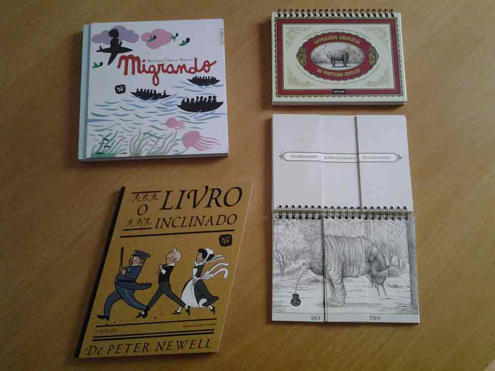 [2] Fotografia conjunta: Animalário Universal do Professor Revillod, de Miguel Murugarren & Javier Sáez Castán, Livro Inclinado, de Peter Newell e Migrando, de Mariana Chiesa Mateos.