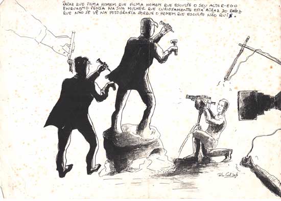 LV: Esse imbrincado de meios está bem visível no desenho de Pedro Cabral Santo no início do livro “POGO, um ajuste de contas com o futuro”, cuja legenda diz “Homem que filma homem que filma homem que se esculpe a si próprio enquanto é desenhado pelo homem que não se vê nesta fotografia”. Há algum “homem que não se vê” no POGO? Como surgem as ideias dentro de um grupo tão eclético?