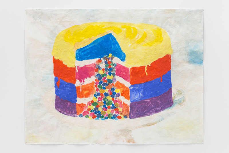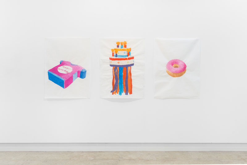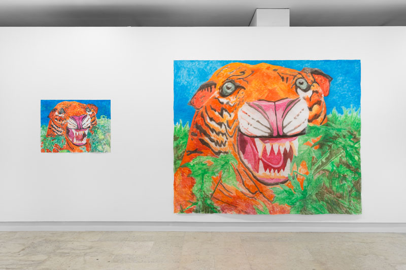 EM: O papel vegetal e o guache surgiram por acaso. Alguém me ofereceu um rolo de papel de arroz e, assim que notei a combinação da transparência e fragilidade do papel, o toque acetinado e o modo como a tinta adquiria uma nova personalidade que contrastava com estas características, fiquei com vontade de explorar este material. Depois de experimentar o ecolin e o acrílico, percebi que o guache tinha o efeito matizado que eu pretendia. O papel vegetal também é interessante por ter esse carácter esvoaçante que o faz parecer frágil, mas sem o ser; neste contexto, os padrões de tecido surgem naturalmente. O tigre, sendo um tema recorrente na Pintura, penso que como o branco: é um íman para os pintores. Também não consigo resistir às cores "berrantes"; aí talvez se notem as raízes africanas, mas também as interpreto como um certo saudosismo dos anos 80.