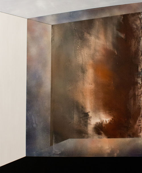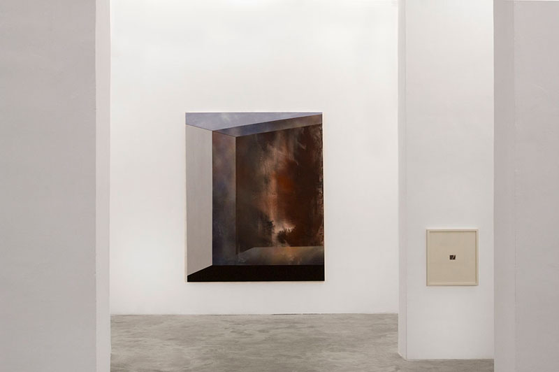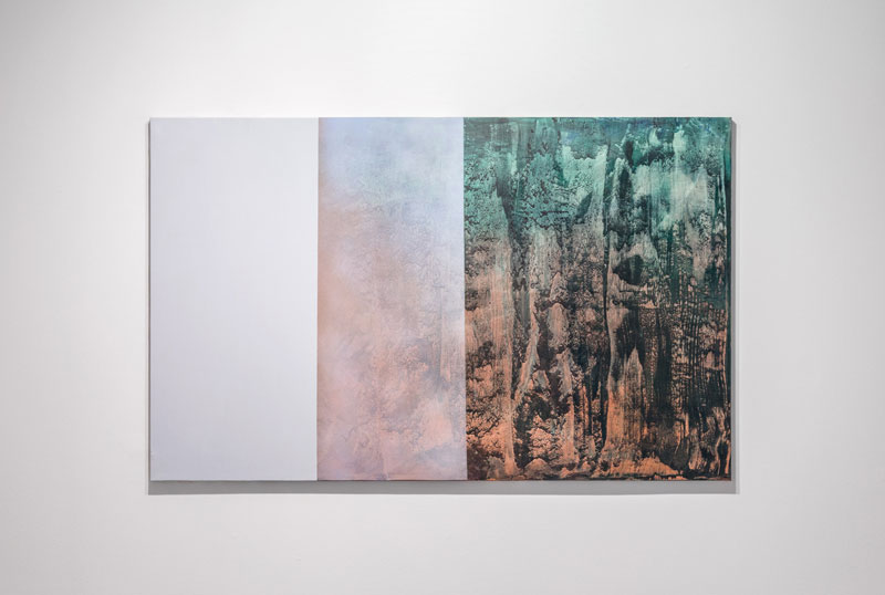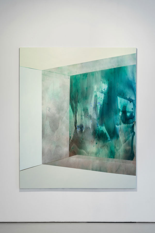 BC: Já as pinturas de grandes dimensões, essas, essencialmente abstratas, compreendem uma lógica que deixa de ser linear e passa, diria, a um entendimento de profundidade, que parece resultar de uma constante dualidade entre dois espaços. Um deles é notoriamente tangível, geométrico, ortogonal e firme, contrastando com um outro: aberto, orgânico, e que dilui qualquer possibilidade de limitação. Nestas pinturas, o nosso olhar deixa de prever, sendo, em vez disso, transportado. Parece-me portanto, uma pintura que em vez de sequencial (como as de pequenas dimensões), integra antes uma passagem de absorção ao espectador, através de um campo aberto: místico, quase transcendente, como se de uma espécie de portal se tratasse. Será aqui, assim, uma questão de espacialidade?