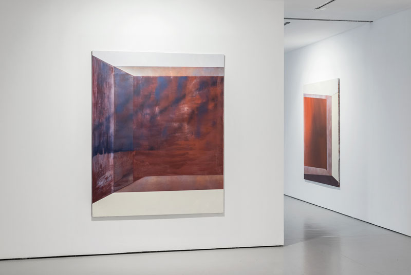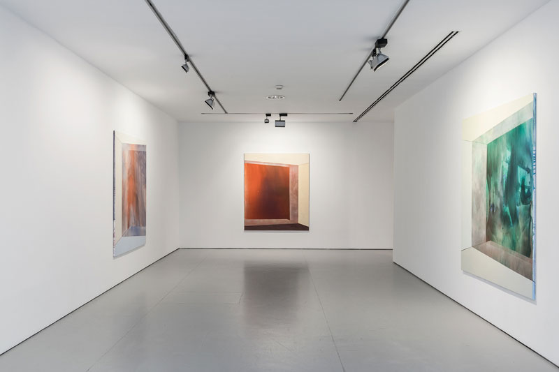 LJ: Este corpo de trabalho de pinturas de grande formato: Threshold, na exposição Podemos sempre fugir de carro e Inside-Out, na exposição We had the experience but missed the meaning, foram trabalhos em que quis ficar na fronteira entre abstração e figuração. São pinturas com a escala do nosso corpo. Em termos de representação, os planos espaciais são credíveis não só pela perspetiva e valores cromáticos, mas porque têm uma escala semelhante àquilo que representam. Por outro lado, estes espaços geometrizados abrem para um campo aberto onde a pintura é mais difusa, mais difícil de definir, estranha. Esse plano de fundo, pode sugerir espaço em abstrato, mas também se assume como superfície de pintura simplesmente. Esse movimento pendular, entre uma passagem espacial e uma vertigem de outra ordem continua a ser um campo de descoberta para mim, porque é essa a minha experiência da realidade. A ideia de vertigem esteve sempre muito presente para mim – a vertigem que há em experimentar a realidade como figurativa e abstrata simultaneamente. É muito sugestiva para mim a ideia de transporte, ligada à ideia de passagem. Mas, na verdade, não te sei responder completamente. Não sou capaz de interpretar as minhas pinturas – acredito que elas se cumprem no outro, no observador que as queira ver.