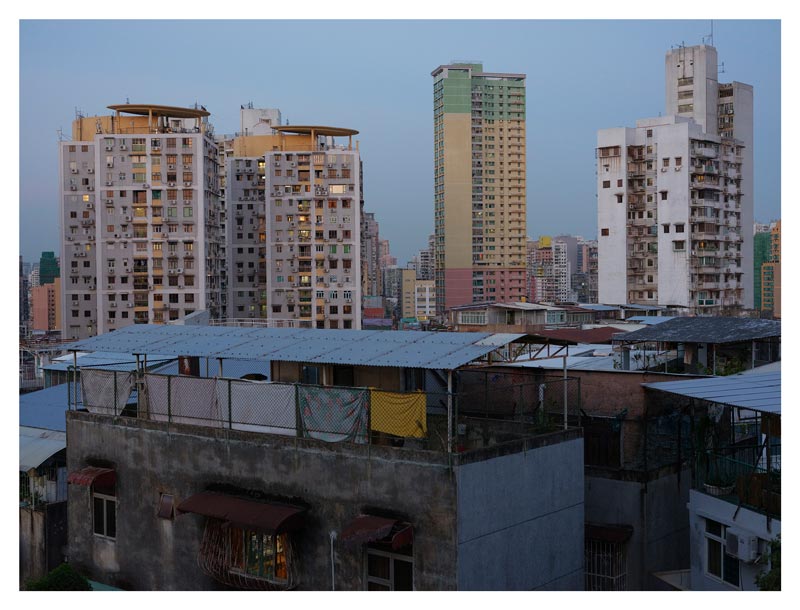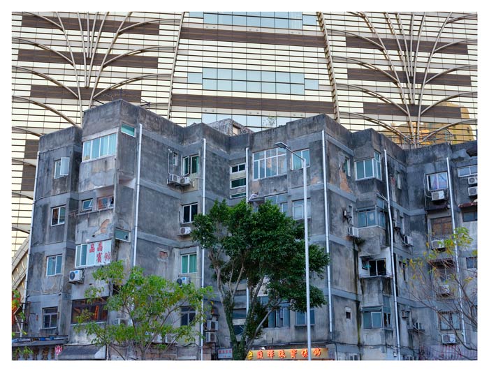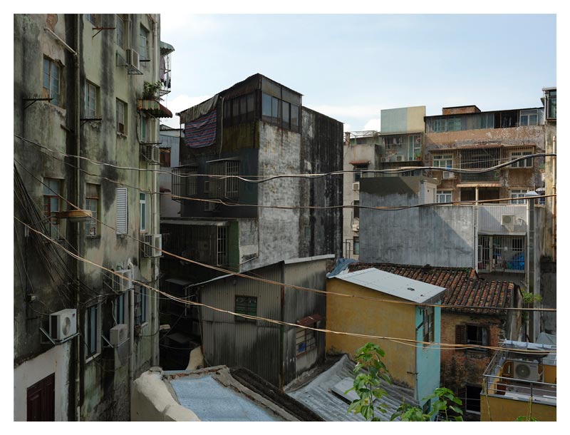 Vou destacar o confronto entre os diferentes momentos das construções que ocupam o território, as fotografias abordam em particular o facto de o novo e o velho estarem ao mesmo tempo muito próximos e muito distantes. Verifica-se simultaneamente uma certa decadência que se liga à passagem do tempo e da história, uma certa sujidade, que tem um valor que por vezes pode ser bastante estético e nostálgico. A cidade possibilita uma experiência quase distópica, não real, que transmite a sensação de uma identidade que não é muito óbvia. Sobretudo se considerarmos toda a zona do Cotai, com o “strip” dos casinos. Eu não podia deixar de destacar toda aquela artificialidade, todo o capitalismo e essa atracção pelo consumo, que me interessa em especial, até pela contraposição com outros locais que existem na cidade.