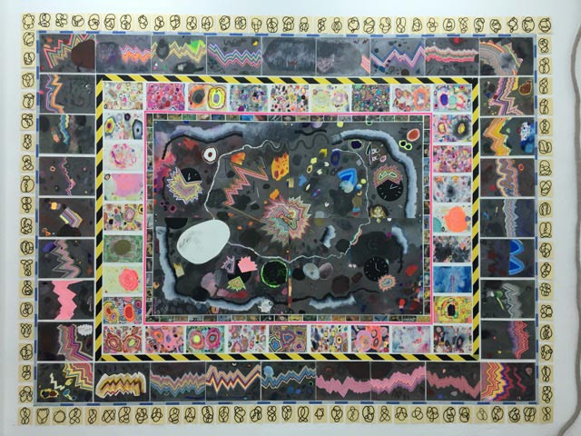 No ano passado, a instituição paulistana localizada no Copan - emblemático prédio de Oscar Niemeyer no centro de São Paulo, com uma população diária de 4 mil pessoas passando por ali – recebeu a primeira exposição realizada em conjunto pelos três artistas. Marcada por desenhos multicoloridos, a coletiva ocupava parte do espaço de 3,5 mil metros quadrados de curvas assinadas por Niemeyer. Em abril, a exposição realizada a seis mãos atravessou o Atlântico para ganhar, em Lisboa, uma versão “pocket” criada para o espaço quadrado e subterrâneo da Kunsthalle Lissabon. Muitas texturas (dá a vontade de tocar em todas as obras), cores extravagantes e um quê de caseiro são características dos trabalhos assinados pelo trio. Mais do que uma coletiva, eles fizeram uma grande instalação, e daí o título Rocambole: todas as suas ideias foram batidas num liquidificador e resultaram num só bolo torcido e recheado.