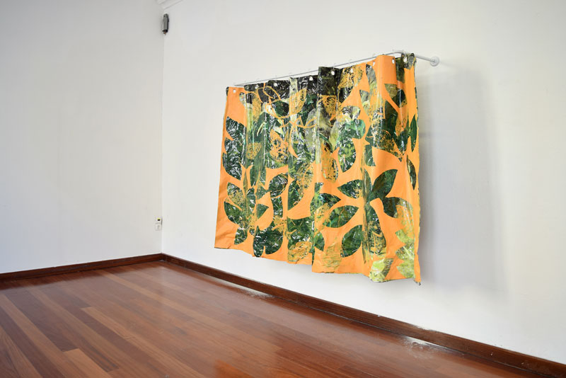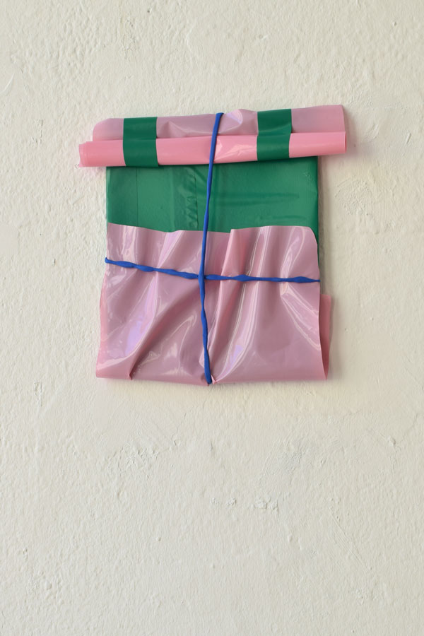 CR: Há no teu trabalho uma sensação de velocidade; o fazer com o que está mais à mão é uma questão de urgência ou de apaixonamento pelas coisas que são próprias ao quotidiano? Coloco-te esta questão pela presença de elementos como, por exemplo, a cortina de casa de banho, mas também de materiais “impróprios” ou “impuros” à pintura, à qual me parece que ainda estás vinculada disciplinarmente. Ao referir-to, lembro-me de gestos como os de Rauschenberg, a pintar em roupa de cama por já não ter outro suporte.