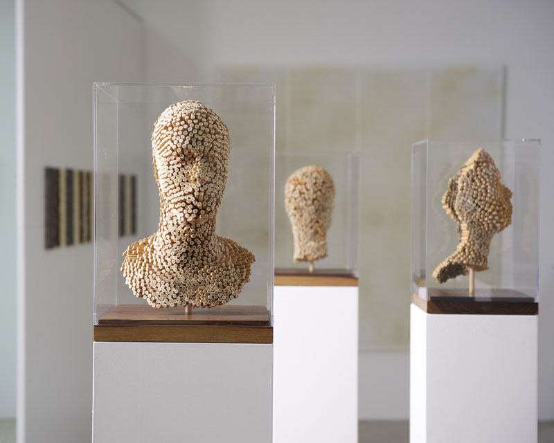 SP: Os cigarros, tabaco, beatas, … são uma constante no teu trabalho desde 2006 e como mencionaste. Entre 2006 e 2016, tens inúmeras obras todas criadas a partir de variações desta “matéria”. Vou isolar algumas que para mim são particularmente interessantes e sobre as quais gostava de saber mais e que apresentaste pela primeira vez na exposição One Hundred And Six Columns, Four Heads And One Table, Villa Concordia, em Bamberg na Alemanha: Untitled (Head #1 a #4) … O que exploras nestas obras?