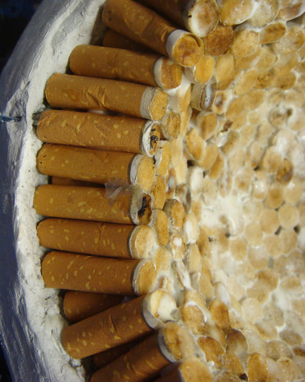 SP: Numa segunda instância, no início da tua carreira através do vídeo, e como referiste, exploraste com o teu corpo, ideias de repulsão e atração. Com estes trabalhos feitos de variações múltiplas de cigarros que por vezes tem representações e/ou temáticas “românticas” (clássicas se preferires, o busto, a mesa de trabalho…), sinto que estás deliberadamente a transferir a experiência (repulsão/atracão) que anteriormente exploraste com o teu próprio corpo, para o corpo do espetador…