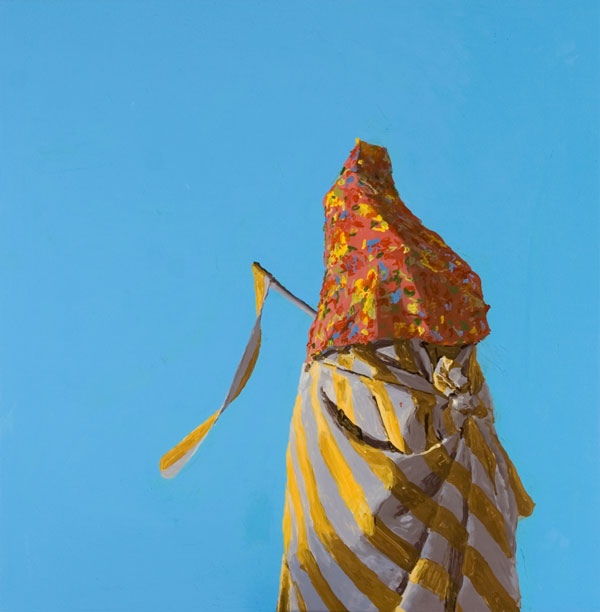 DVM: As cores, convinha falar nas cores porque muitas pessoas dizem que gostam das cores do que faço, que a cor as impacta. Havia até aí uma história de um "azul Melim" contada por uma amiga minha, por conta do uso sistemático de uma espécie fundo azul-Photoshop em muitas pinturas de há alguns anos atrás, e que lhe agradava bastante e dizia ser o meu azul. Na verdade, o azul estava lá para colocar os modelos no exterior, mas não era realista porque na altura eu não podia pintar literalmente no exterior, por isso usava o azul mais básico que conseguia, tipo capa da National Geographic dos anos 70, para nem tentar ser realista, era só mesmo para situar aquelas coisas na rua. Depois, eram vários tipos de azul diferente, porque eu sou péssimo a repetir seja o que for, tem é de funcionar naquela pintura. Depois, começou a irritar-me acharem que eu colocava sempre fundo azul em tudo, porque foi só uma fase em que aquilo era importante. Mas era impactante sim, em primeiro lugar para mim, porque o azul é a nossa experiência primordial de abraço cromático que o espaço nos dá, então as coisas perante ele cantam, as cores cantam. Eu não me preocupo muito com as cores, porque não estou interessado nesta ou naquela cor em particular, mas na dança que elas criam em cada imagem. Ou seja, trabalho quase sempre a partir das três primárias, mais preto e branco, e faço as cores todas a partir daí, com imensas nuances, para não ficar aquela cor estereotipada vinda direta do tubo da fábrica, mas o facto de fazer as cores todas a partir das primárias garante que a mistura nunca fica igual perdendo-se aí aquela sensação de cor estereotipada. Sou o maior nabo de sempre a falar de nomes de cores, não sei quase nada, mas sei as percentagens CMYK a olho de qualquer cor (enfim, com muita tentativa e erro pelo meio) que me ponham à frente, porque é assim que eu penso: quanto de branco, preto, vermelho, azul e amarelo é que preciso para chegar àquela cor. No entanto, o mais importante na cor tem também a ver com o facto de usar sempre as primárias, mas não é nada disto que referi até agora. É que as cores primárias (e as secundárias, terciárias, por adiante, mas de modo menos essencial) transportam arquétipos humanos que me interessa evocar. Em cada cor há um pouco de todas as outras. Quer literalmente (no espectro lumínico do amarelo, por exemplo, há as outras cores todas, simplesmente há mais amarelo), quer na paleta, pois cada cor que faço é sempre misturada com as outras, nunca vai pura. E em cada composição, por mais que uma ou duas delas dominem, é importante haver uma embaixada, por minúscula que seja, dos outros espíritos primordiais: da garra inflamada do vermelho, da jocosidade do laranja, da frescura amarga do verde, do abismo do negro, do embalo espacial do azul, etc., porque nós temos isso todo o tempo dentro de nós em todos os momentos. Isso é que é o mais importante sobre a cor numa imagem minha, é esse festival constante de emoções. O que acaba por ter algumas consequências no tipo de modelos que escolho, desde bandeiras de festa até modelos com roupa abandalhadamente colorida, mas é independente do modelo em concreto que uso numa imagem específica, tem a ver com uma conceção da cor, uma conceção do olhar sobre o mundo, e querer que cada imagem seja um mini-parlamento das emoções humanas. E isso tem de dialogar com o modo como a composição está articulada, os vazios, os cheios, os escuros, os claros, enfim, é todo um mundo. A imagem pode ser muito quieta composicionalmente, mas o uso da cor faz com que ela tenha sempre de falar de um espetro vasto de emoções humanas. Mas regresso aqui ao que disse no início, nada disto vale nada se não transmitir diretamente algo relevante a quem vê. No entanto, cada um é que saberá que conversa tem com a pintura. Apesar de me interessarem cada vez mais o uso de títulos que dão uma intenção específica a cada pintura, naturalmente não é uma experiência unívoca e não procura uma eficácia literal. A imagem e o seu título procuram apontar muito concretamente uma zona de experiência humana, mas cada um que passa pela pintura é que sabe o que faz nessa zona e dessa zona.