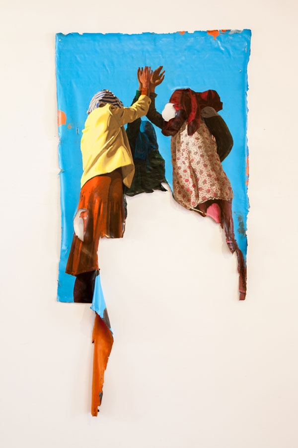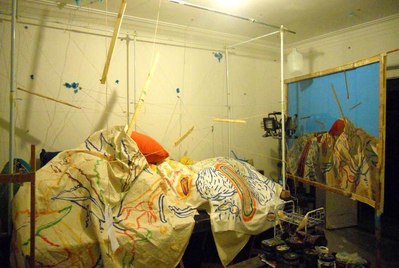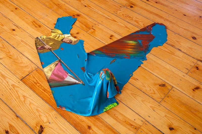 DVM: É nesse mesmo sentido em que misturo canto de raiz antiga (ou da terra), com música de caráter autoral/experimental/electrónica. Sinto que faço a mesma coisa com as imagens, com as pinturas e desenhos. A diferença é que imagens faço há 15 anos, pelo que a minha confiança e lastro técnico são muito mais sólidos. Mas é a mesma coisa. Eu podia falar durante dias sobre o tal do "meu imaginário", sabes? mas no final as coisas têm de funcionar por si, porque ou há uma transmissão direta de algo relevante desde a própria peça às pessoas ou nada do que diga acerca das minhas obras pode servir de fita-cola conceptual para tentar aguentar o que não se sustém em silêncio. Mas sim, tem a ver com movimentos viscerais de presenças antigas, por exemplo figuras de carnaval de locais pobres (sem o olhar fetichista de quem vê de fora, é mais porque eu cresci nesses locais), tem a ver com plantas, com roupa amontoada, com a banalidade desta existência fantástica de estar vivo. As imagens querem-se fortes mas referindo sempre a precariedade da sua construção: sejam as peças só de tinta sem suporte (pintadas em vidro e depois arrancadas e expostas como camada autónoma e visivelmente irregular), sejam estas peças a óleo em madeira de estabilidade aparentemente duvidosa, é muito importante que o impacto solar das imagens (cuja composição tento até à exaustão que contenha apenas o essencial) não deixe criar uma aura de impecabilidade. É nesse sentido que falo de quando abordas música antiga com uma visão eletrónica, porque quando faço uma imagem que evoca algo antigo ou da terra, tento que haja um ruído qualquer, uma perturbação, um erro, uma marca de humanidade autoral e parcial, para não se entrar no transe nostálgico-folclórico-tradicional. Por outro lado, apesar de dizer que quero apenas o essencial em cada composição, detesto coisas impecáveis, frias, inatingíveis ou supostamente "cool". O calor (térmico e afetuoso) é muito importante para mim, daí a luz nos meus trabalhos ser sempre ou do sol direto ou de candeeiros quentes. Quando estive a estudar na Goldsmiths a estudar Antropologia e Trabalho Social, foi das coisas que mais me custou, o frio térmico e humano de Londres. Sou um gajo do Sul. É uma questão espiritual e fisiológica, não é qualquer retórica pan-regionalista ou do pobrezinho do Sul da Europa, mas eu sou mesmo de cá de baixo. Mas é um cá de baixo que, no entanto, é do Hemisfério Norte, desta espécie de "Suécia do Magreb" onde vivemos. Já não me lembro quem se referiu a Portugal nestes termos, mas acho a acidez absurda da expressão maravilhosa, até porque aponta sem qualquer pompa nacionalista para esta dimensão entre-mundos do território que habitamos, este trapo roto de Império Colonialista (Sul do Norte e Norte do Sul) que foi mas cujos buracos podem deixar aparecer criações bem vivas hoje. Ouves isso nos discos épicos do Fausto, e no sarcasmo genial dos Gaiteiros de Lisboa, mas também por exemplo nas explorações dos Buraka e de tantos outros. Portanto, por vezes incluo imagens de outros lugares da Terra, porque por exemplo há rituais antigos Portugueses (com enormes consequências sociais, plásticas, musicais) que estão muito mais vivos no Brasil do que em Portugal, como as Cirandas e o culto do Espírito Santo. Daí que já tenha feito duas individuais por lá no Brasil, e uma residência de 4 meses. Uma grande cantora de raiz tradicional/autoral de lá, agora minha amiga, a Renata Rosa, usou as minhas pinturas para a edição Brasileira e Francesa do seu último disco. Estas coisas tocam-me muito. Em geral, sinto-me muito mais motivado a ir a um antiquário, ou participar num círculo de canções indígenas, do que ir a uma galeria de Arte. Claro que estou a falar em geral... A título de exemplo (porque há tantos autores que me tocam), com uma exposição da Paula Rego, do Francis Alys, do João Jacinto ou do Morandi a história é outra. Há uma dimensão de espírito exigente e cheio de amor nas coisas que me tocam, não é por ser Arte ou não que as coisas me tocam, tem a ver com o lugar humano de onde vêm.