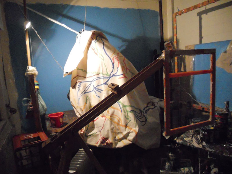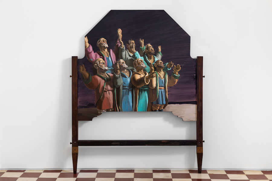 SP: Se concordares, sugiro explorarmos nesta conversa as três “formas primordiais” que diferenciaste, imagens, performance e música, e trabalho com pessoas, e talvez posteriormente entender como estas se cruzam. Começando pelas imagens, fala-me da tua pintura em madeira / “mobiliário” / objetos / que eu pessoalmente acho fascinante e muito enigmática, potencialmente contraditória (daí fascinante) quando a base é visivelmente já “antiga”, seja um móvel completo ou apenas parte dele. Porque acrescentar uma intervenção a um objeto por si já intervencionado e antigo, e não começar num suporte “virgem” / intocado?