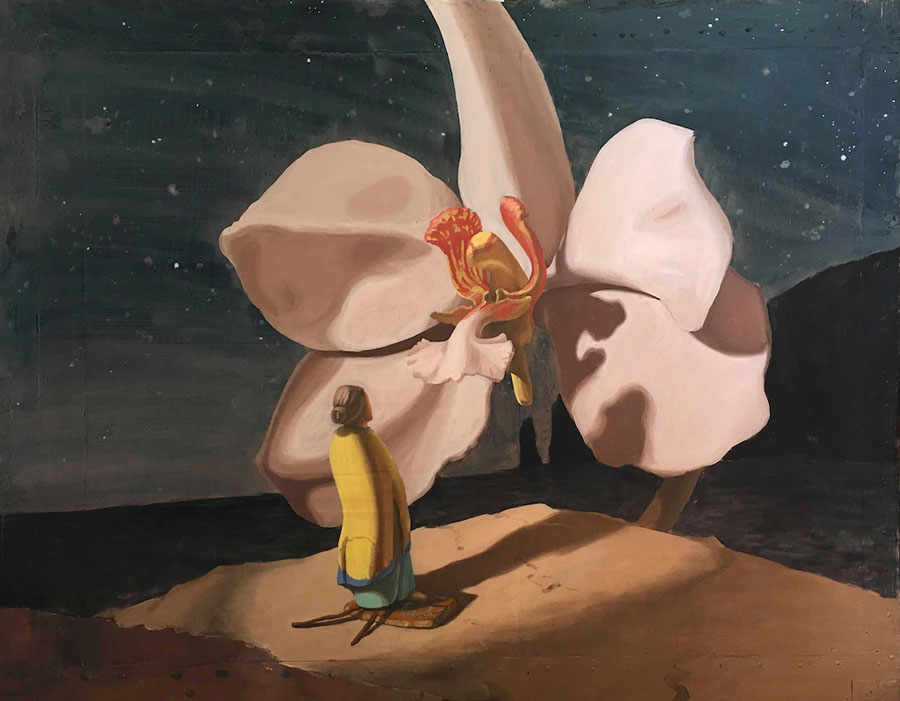 DVM: Às vezes começo por um bocado de madeira que encontro num antiquário, ou nos escolhos de restauro de uma capela. Às vezes também começo com uma madeira nova que compro na serração, não tem de ser antiga. Não é por ser um "móvel", pois a maioria dessas vezes em que uso madeira antiga é só um fragmento de uma peça que já foi, é por ser de madeira e ter uma história. Muitas vezes é mesmo o quebrado ou inacabado que dão vontade de pintar. Isto começou tudo porque há um par de anos uma amiga minha restauradora de Arte Jelka Baras me arranjou um painel de madeira do Séc. XVII que estava por detrás de uma tela numa capela de Nossa Senhora dos Anjos na ilha da Madeira. Iam deitar o painel fora, mas ela guardou, sem saber bem para quê. Restaurámos o caruncho e acabei por usar o dito para a minha primeira pintura a óleo (desde a FBAUL que não pintava a óleo, e na verdade sinto que ainda estou a aprender os seus fundamentos). Deixei também um bocado da superfície do painel à vista, sem tinta, porque tem uma textura incrível. A imagem (chamada "meditação: a mulher de madeira", adquirida pelo MUDAS) mostra uma pequena figura feminina de costas a olhar para uma orquídea enorme, que de algum modo evoca a tal Senhora dos Anjos atrás da qual aquele bocado de madeira esteve desde 1600 e tal. A figura feminina (tal como no caso de uma imagem que tive na minha individual na Monitor em Lisboa, por quem comecei a ser representado recentemente) vem de um presépio feito no Séc. XIX pelo bisavô analfabeto de Herberto Hélder. Boa parte das coisas que faço lida diretamente com um lastro antigo ou da terra, então lido com as tradições e forças vivas de cá. Mas não me interessa nada essa coisa de "sou Madeirense" ou "sou Português". Por acaso acontece que estou aqui, e, portanto, lido com o lastro do que é viver nesta circunstância (ser deste sítio que tem estas memórias tão fortes e contraditórias, mas estar aqui e hoje com tudo o que isso implica), e abro-me a isso, mas se fosse de Acapulco ou das Ilhas de Svalbard era a mesma coisa. Tem a ver com lidar com as forças presentes. A madeira tem essa memória, esses veios, esses nós, e a matéria do óleo sobre ela parece prestar-se bem ao que ando a tentar fazer, ao espaço imagético que ando a criar. Curiosamente, o lugar onde cresci também se chama Madeira. Estas coincidências linguísticas...As palavras são muito importantes. Não é à toa que comecei nos últimos anos a estudar e a criar música, porque escrevo (sobretudo o que se pode chamar de "prosa poética") há muitos anos e quis começar a assumir essas palavras que escrevo inteiramente, dar-lhes um corpo e uma expressão pública, aos poucos. Nunca quis publicar, nunca me interessou a vida de escritor, mas já a vivência musical interessa-me cada vez mais. E que esteja bem juntinho à pintura. As imagens têm um som, elas próprias emanam uma vibração. Fiz a performance de abertura da Bienal de Coimbra já nesse sentido: cantando as pinturas que lá tinha, misturando canto e música eletrónica. Um dos critérios de aferição de se uma pintura está acabada é o som que ela faz. Não é muito fácil de explicar, mas é bem prático. Os elementos da imagem (subidas, descidas, formas, símbolos, pinceladas, vazios, etc.) emitem todos um ruído. Se algum me irritar muito, tem de ser mudado até não me irritar o som dele. Se não conseguir que deixe de me irritar, não se expõe. A madeira, como suporte, parece que já tem o abraço de base que torna o som que a pintura vai fazer arredondado. Eu gosto de coisas arredondadas, podem ter retas, mas as extremidades quase sempre vão ser arredondadas. A madeira dá um som de base redondo à imagem.