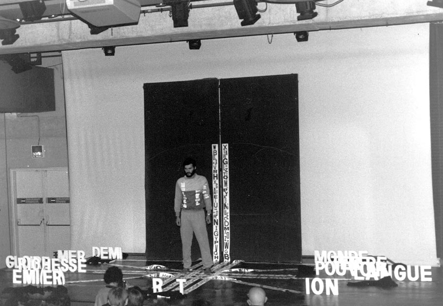 FA: Foi uma aventura em todos os sentidos. Sobretudo pela maneira como foi organizado. Ficámos até ao último momento sem saber se teríamos dinheiro para as despesas com a viagem ou de estadia, mas arriscámos ir na mesma, eu a Elizabete Mileu e o Manoel Barbosa, sem uma resposta do Egídio Álvaro. Fomos até Paris numa carrinha emprestada pelo meu pai. Quanto à estadia, ficámos todos, nós e os restantes performers a dormir na Galerie Diagonalle, que pertencia ao Egídio. Relativamente à experiência artística, foi ótimo. Foi muito bom ver os trabalhos de todos os participantes num contexto diferente, com público estrangeiro, num auditório bem equipado. A performance que apresentei deu-me muitíssimo trabalho a preparar. Consistia basicamente numa série de tiras de plástico, bastante compridas, com centenas de letras abertas em papel autocolante coladas nessas tiras, e várias dezenas de letras recortadas em esferovite com cerca de 40 cm de altura, de modo a que pudessem ser colocadas de pé no palco do auditório, e ia construindo palavras com essas letras, que “dialogavam” com as “frases” em plástico colocadas na tela do palco.