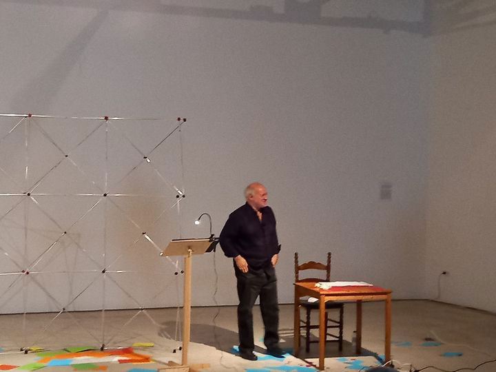 FA: Essa questão é curiosa, nunca pensei na estrutura como uma configuração de arte cinética, apesar de existir alguma lógica nessa leitura. A estrutura tem a particularidade de se abrir em poucos segundos e passar de um pequeno objeto constituído por varas metálicas, para uma armação com 3 metros de altura por 4 metros de largura, que utilizo essencialmente como suporte de escrita, como uma página tridimensional onde a “escrita” se compagina. Esse efeito de ilusão ótica é suposto acontecer precisamente para transportar o espectador para outra hierarquia do dizer, para outra dimensão espacial mas igualmente poética. A estrutura é utilizada como página para escrever no espaço.