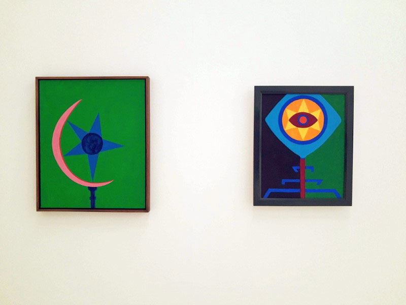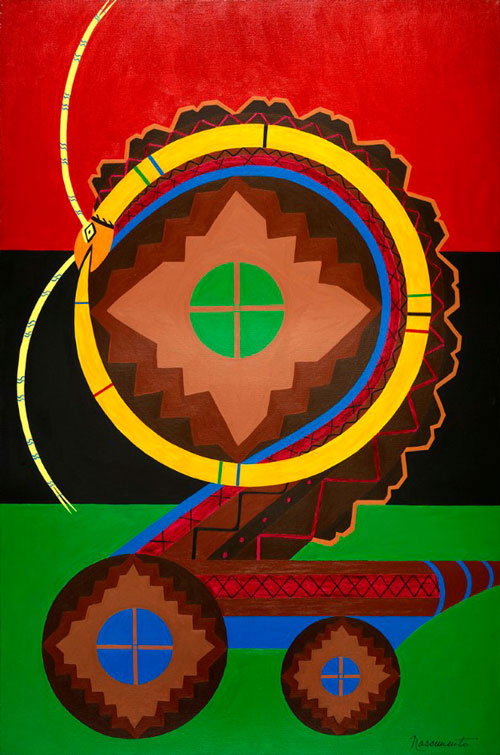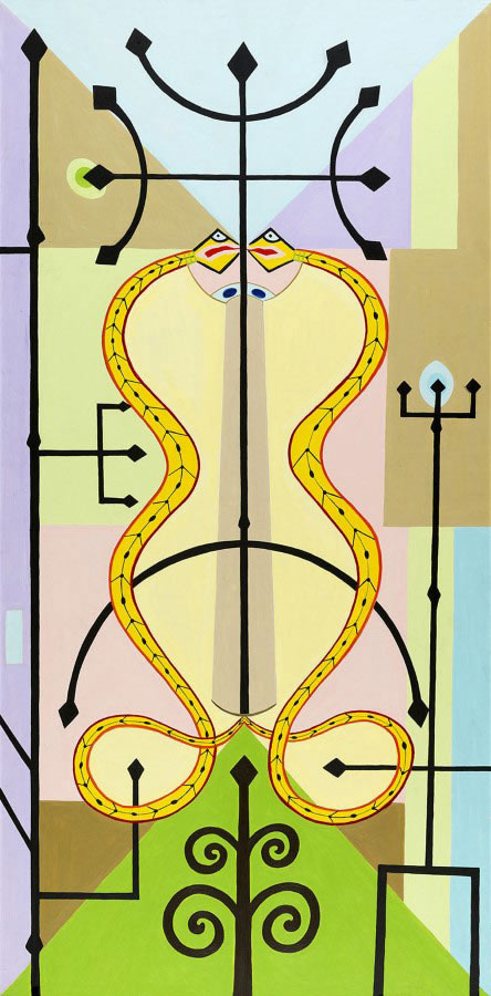Douglas de Freitas / Instituto Inhotim: É interessante pensar nas mitologias que cada trabalho envolve, cada um ao seu modo. Tunga cria a mitologia do seu trabalho, da transformação das matérias, dos ciclos, e muitas outras, e Abdias, abordando as religiões de matrizes africanas, com os orixás e outros elementos simbólicos da religião que passam a ter função estética na obra, para além da sua função espiritual da religião. Em certos pontos, essas mitologias se tocam na exposição. Um exemplo é Simbiose Africana nº 3 de Abdias, que apresenta a cobra que abocanha o próprio rabo, e Toro de Tunga, composta de anéis de ferro e ouro. Tanto a cobra que abocanha o rabo, conhecida também como Ouroboros, quanto o toro, representam tradicionalmente o conceito de eternidade, de ciclo eterno.