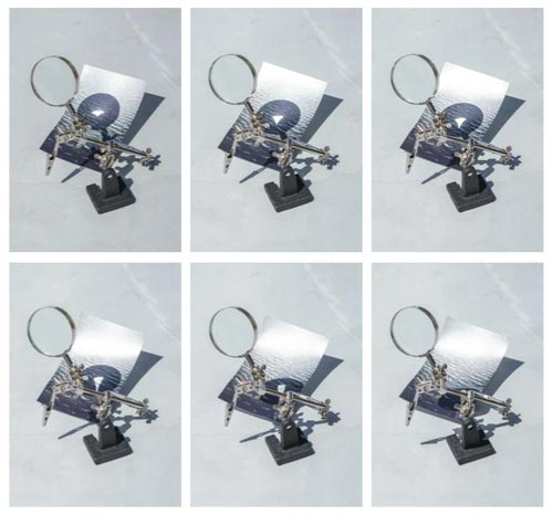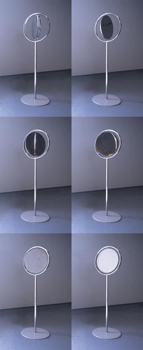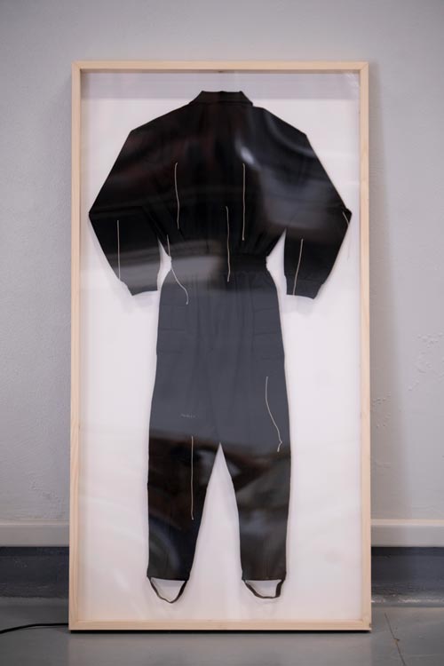 IL: Uma delas já tinha exposto no Útero mas não estava em Portugal e não assisti a nada. Chama-se "I forget what I was doing". Por norma não gosto de expor peças que já expus, porque aproveito a energia e motivação dos deadlines para fazer coisas novas, mas neste caso queria muito ver a peça exposta. E melhorei-a. Está diferente. Também estou a expor uma nova peça em metal, que fiz com a ajuda da Liliana ferreira do atelier da serafina. Estive um ano há procura de serralheiros para me ajudarem e nada... em tempo record a Liliana aceitou e fizemos a peça! Adorei fazer a peça com conjunto com ela, não podia ter sido melhor. Esta peça é espelhada, toda em inox polido. Parece quase um sinal mas depois tem uma bolacha que vai girando com o vento e espelhando o exterior. Idealmente é uma peça para estar no exterior, mas neste caso é activada com uma ventoinha. E também tenho expostas fotografias no acervo, trabalhos desde 2019. Uma fotografia é de uma ventoinha a soprar sobre fumo. É incrível pensar nisto: o vento leva pragas, leva espécies, leva tudo... É fascinante. O vento traz e leva muitas coisas.